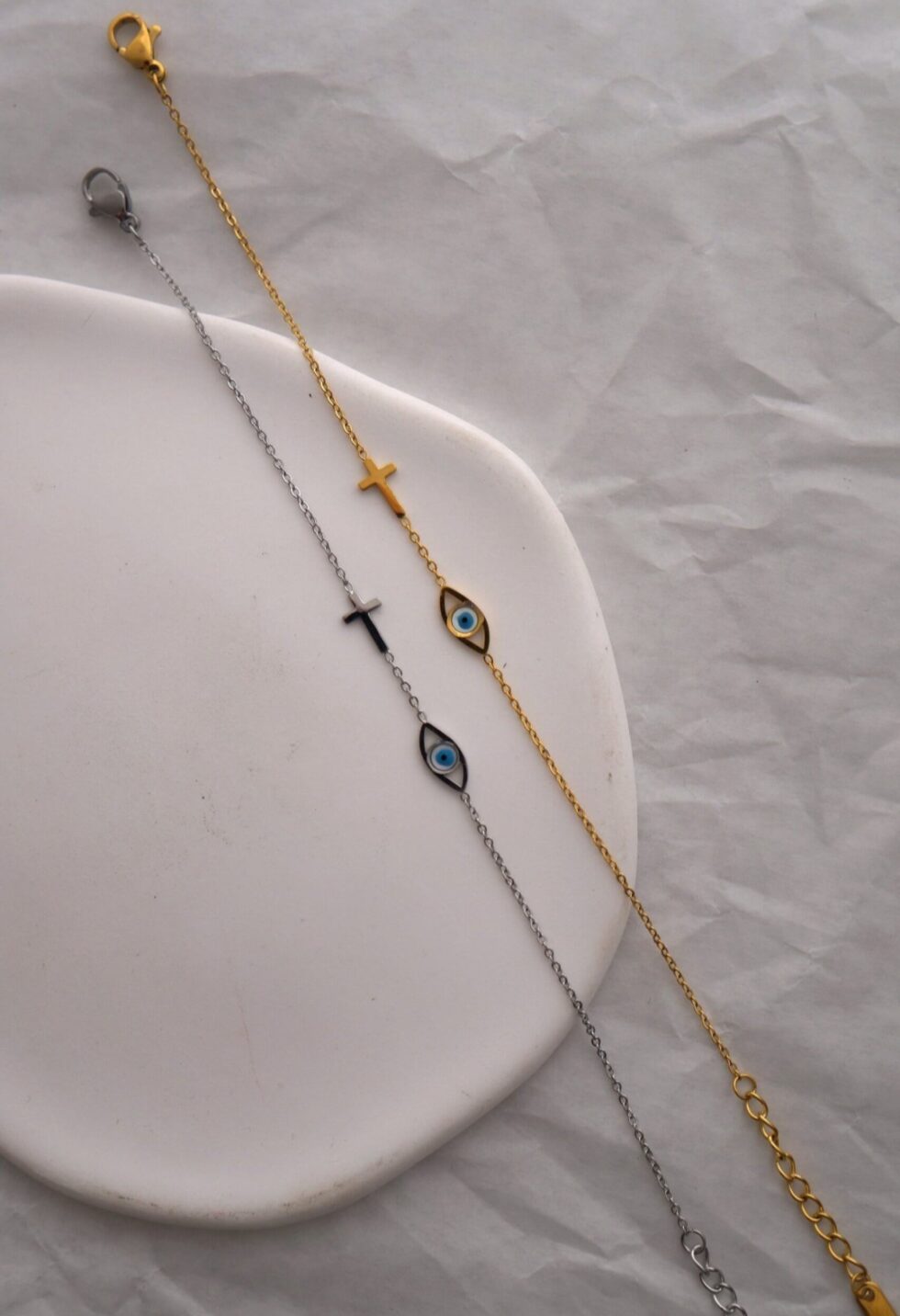 Βραχιόλι σταυρός με μάτι ανοξείδωτο ατσάλι επιχρυσωμένο και επιπλατινωμένο v63