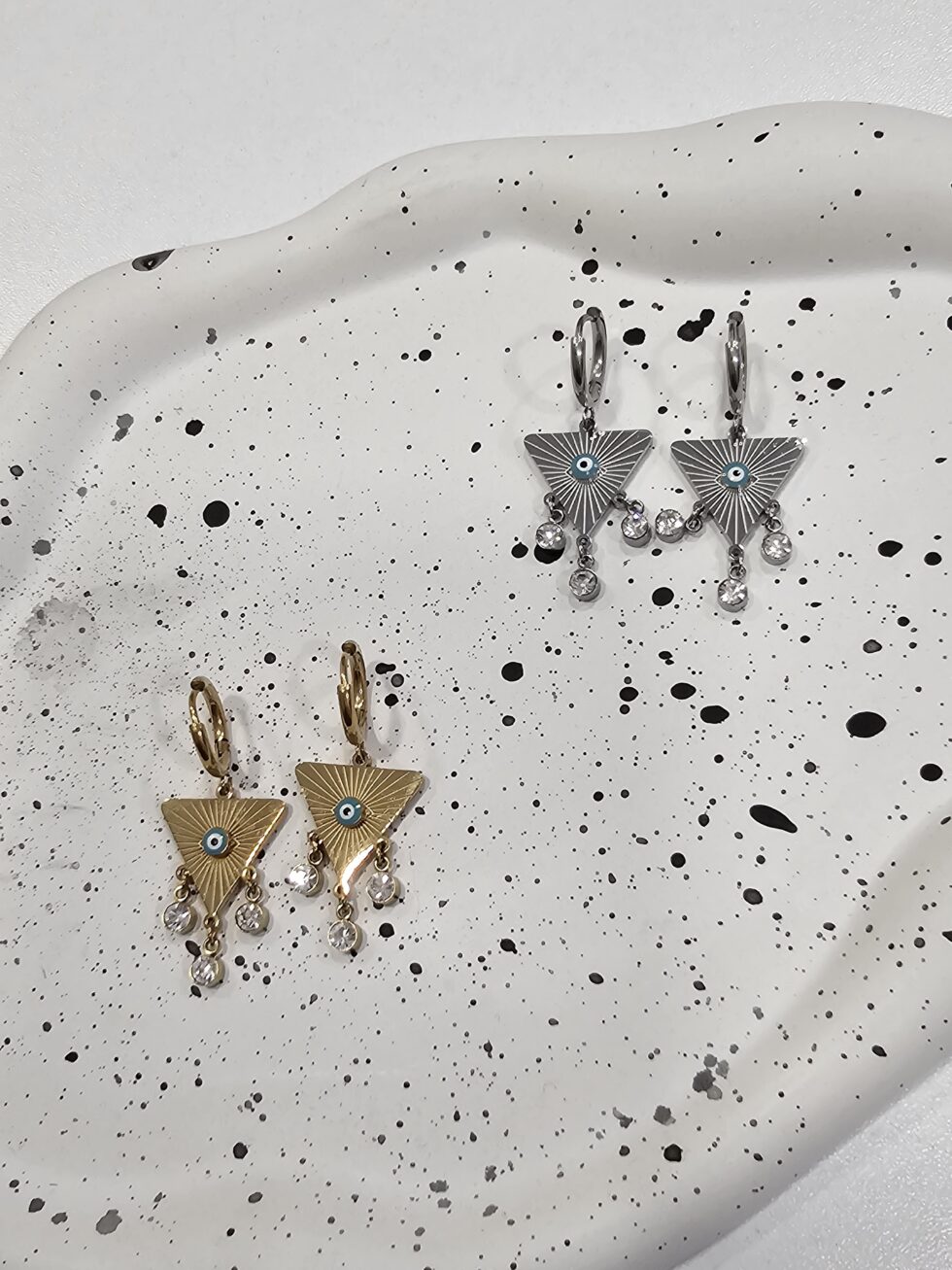 Σκουλαρίκι τρίγωνο με μάτι και στρας ανοξείδωτο ατσάλι 4εκ επιπλατινωμένο και επιχρυσωμένο sk06